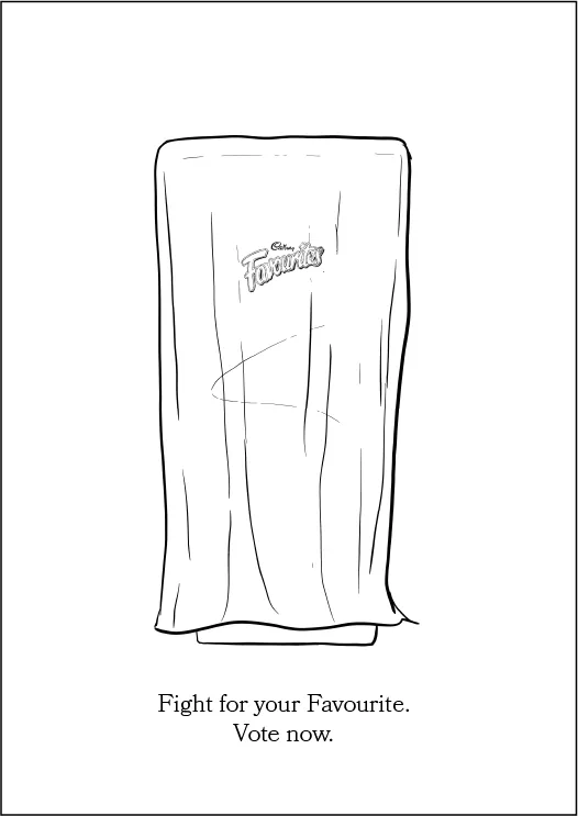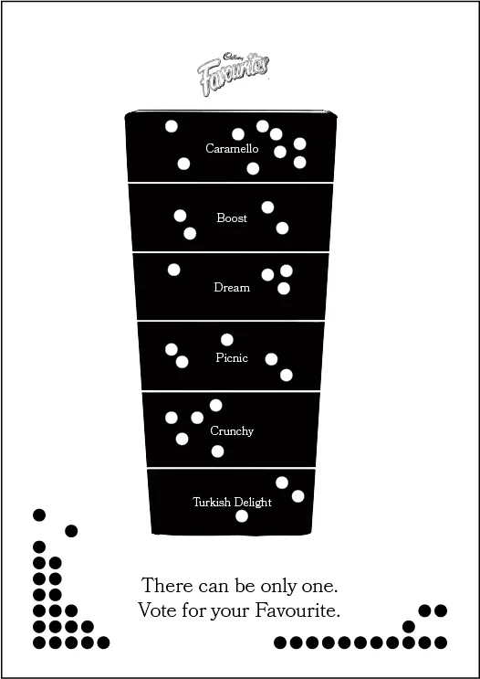 Step 1a: Deploy posters where the public can vote for their preferred Favourite using stickers that are cut into the poster. Place a few votes to show people how it works.