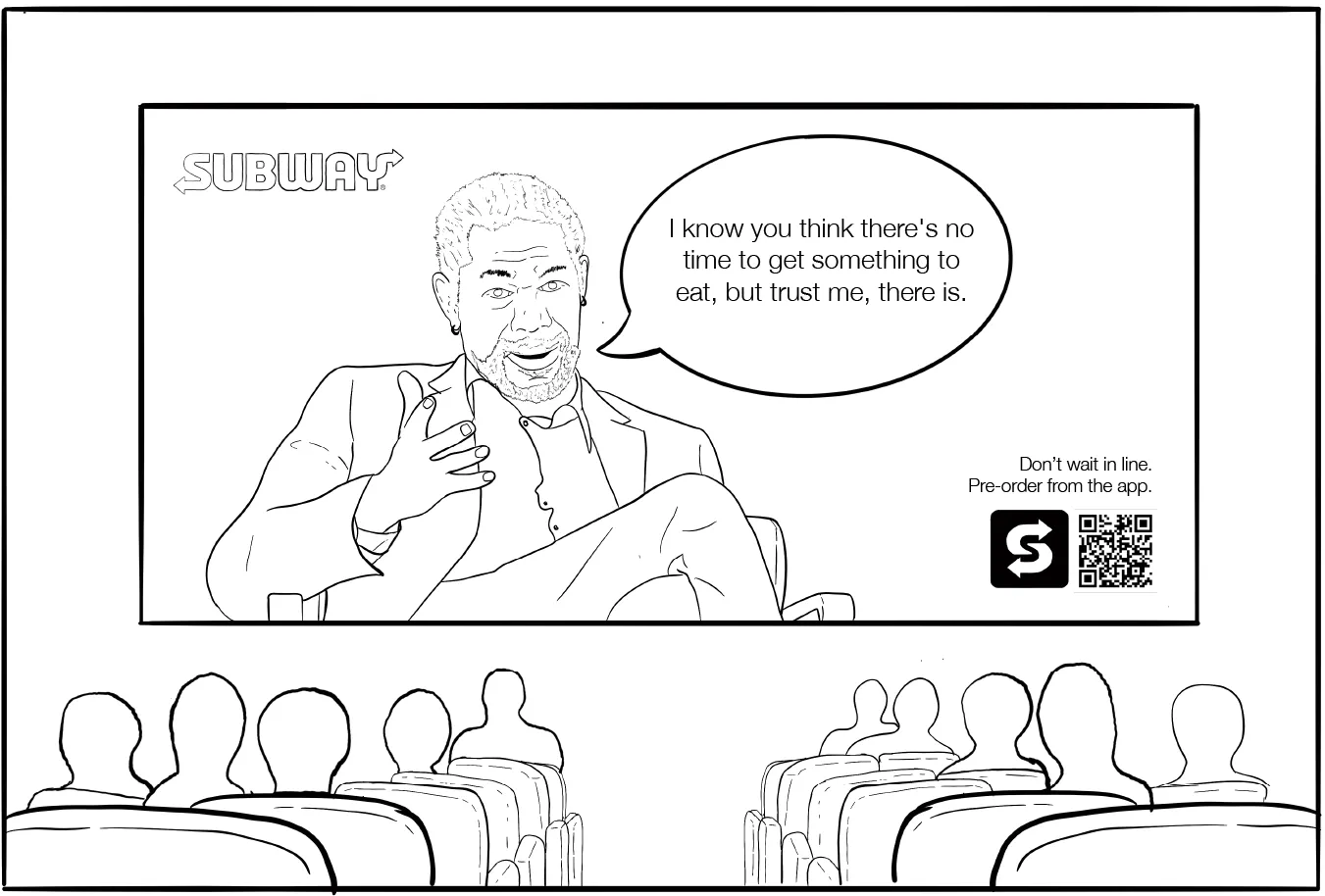 Execution: Feature Morgan Freeman and his affirming voice. The ad would introduce the app and encourage people to pre-order a Subway and pick it up without waiting in line before the movie starts. They can enjoy their meal while watching the film, ensuring they make the most of their time at the cinema.