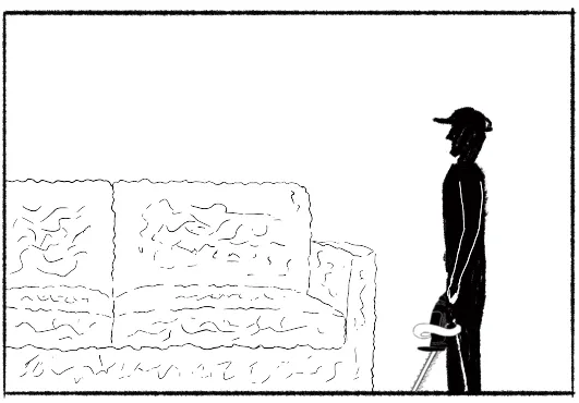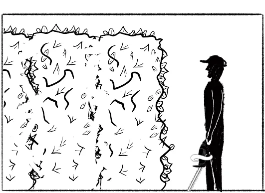 Cut to a wide shot to reveal him standing before a sizeable unkempt hedge.