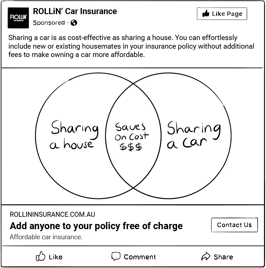 Execution: Target the many share house groups on Facebook and promote the idea of a shared car that saves money by splitting the cost of running a vehicle. Group members are encouraged to join ROLLiN' so they can easily add new or existing flatmates to their insurance policy at no extra cost.